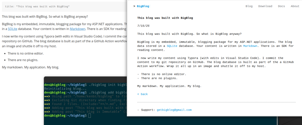 BigBlog turns your Markdown files into a SQLite database, plug-and-play ready for yourASP.NET Core app. No static generators. No bloated CMS. Just clean control.